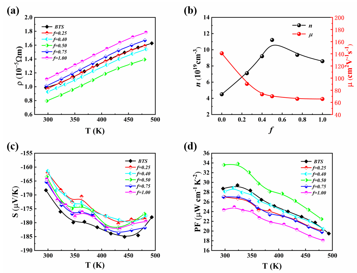 Dependence of (a) electrical resistivity; (b) hall concentration and mobility; (c) thermopower; (d) power factor; of BTS/fwt%MnSb2Se4 (f=0, 0.25, 0.40, 0.50, 0.75 and 1.00) samples with temperature. (Image by CHEN Tao)