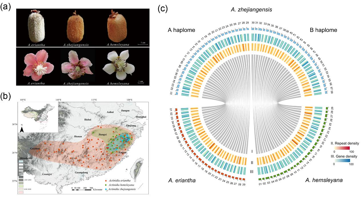 Morphological characteristics, genome features and geographic distribution of A. zhejiangensis, A. hemsleyana and A. eriantha. (a) Morphological characteristics for fruits and female flowers of A. zhejiangensis, A. hemsleyana and A. eriantha. (b) Circos plot of the A. zhejiangensis, A. hemsleyana and A. eriantha genomes (Image by YU Xiaofen)