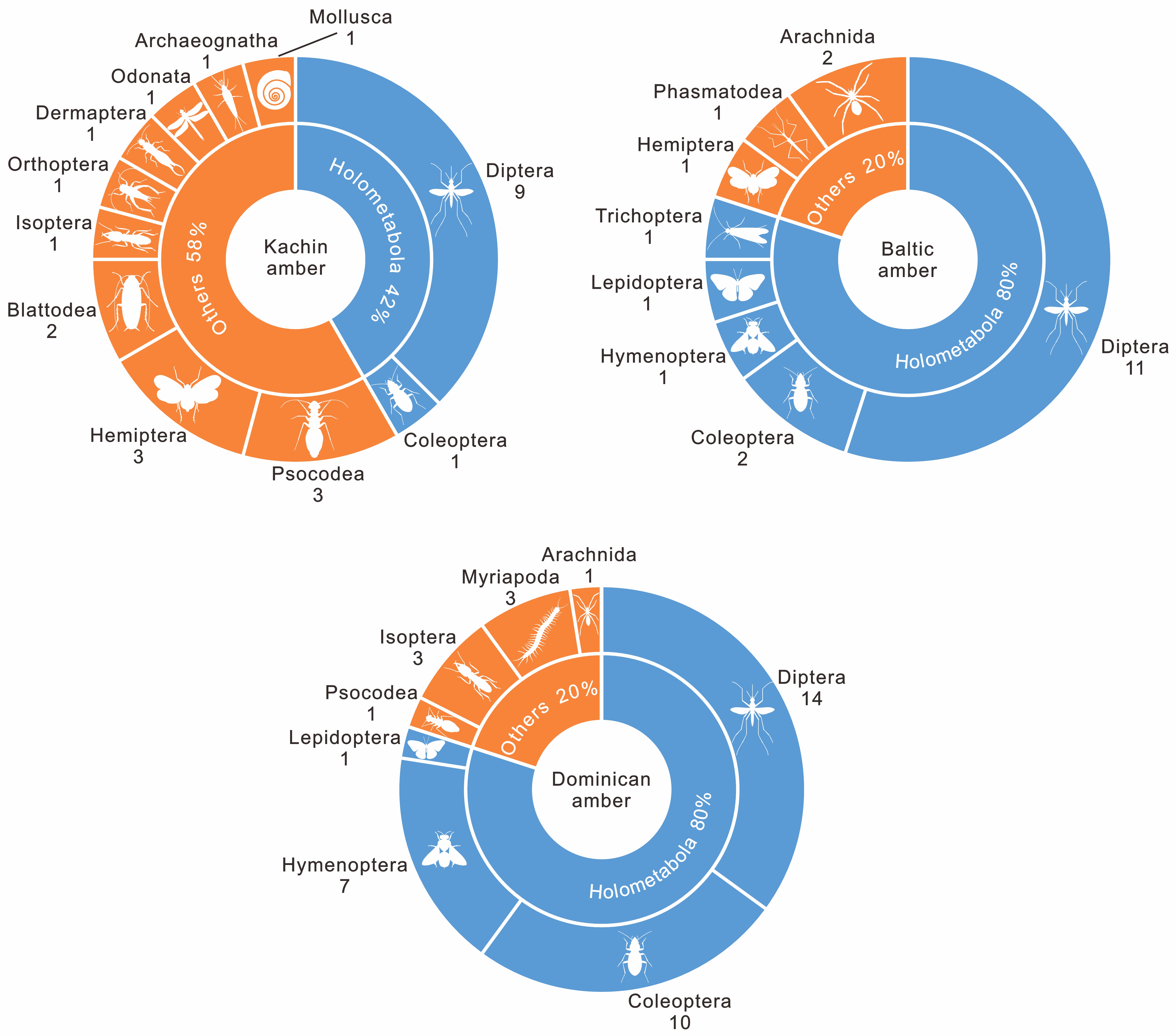 In addition, among the insect hosts of mermithids preserved in Kachin amber, only one of the nine orders (Diptera) is holometabolous, whilst it is four out of six in Baltic amber and all three in Dominican amber.