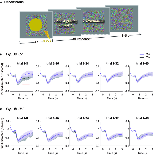 Emotionally neutral CS+ (associated with a negative outcome) with LSF, but not with high-spatial-frequency (HSF), elicited stronger skin conductance responses (SCRs) and larger pupil diameters compared to CS- (not associated with a negative outcome). Additionally, unconscious fear associations were rapidly acquired within a few trials but gradually habituated as the conditioning progressed. When the unconditioned stimuli was removed, the established fear conditioning rapidly disappeared.