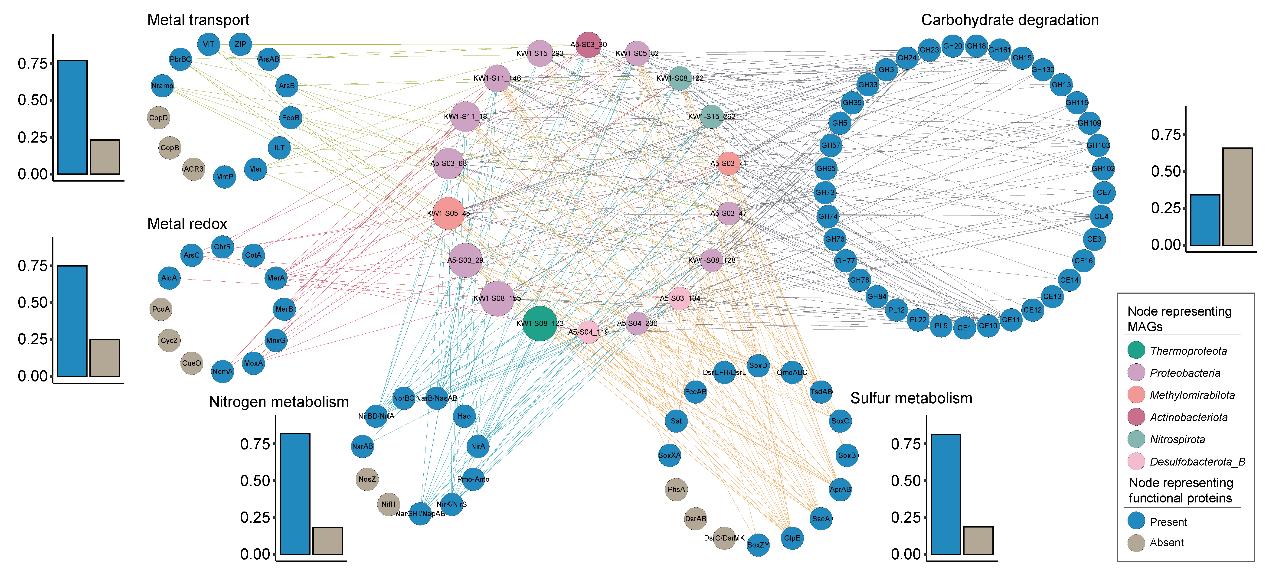 The researchers revealed extensive redundancy across taxa for pathways of metal resistance and transformation, the highly diverse mechanisms used by microbes to obtain nutrition, and their participation in various element cycles in these unique environments.