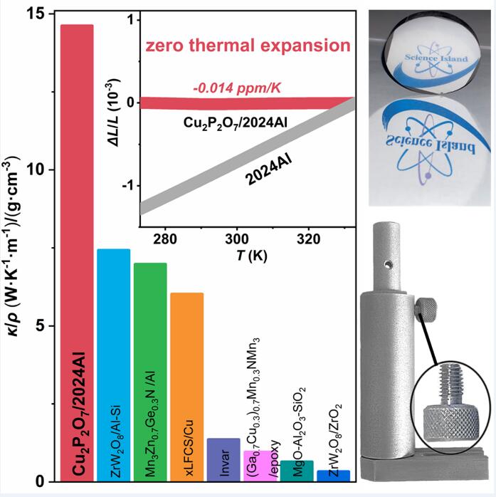A research group led by Prof. TONG Peng from the Hefei Institutes of Physical Science of the Chinese Academy of Sciences has significantly improved the negative thermal expansion (NTE) effect of Cu2P2O7, a new but excellent NTE material, and prepared a zero thermal expansion (ZTE) Cu2P2O7/2024Al composite with high specific thermal conductivity and good machinability.