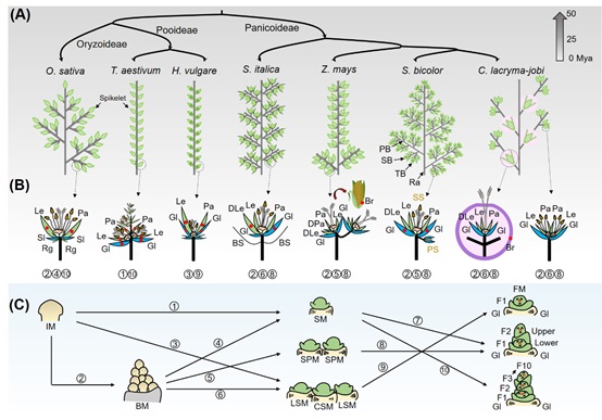 By comparing the representative morphological structures of inflorescence, spikelet, floret, and hull-like floral organ among seven major crops (rice, wheat, barley, millet, maize, sorghum, and coix), similarities were observed in spikelet development within the same genus, while different traits exist in different genera. For example, in the "three-floret spikelet" hypothesis in rice, the original glumes are reduced, with two lateral putative florets developing into hard glumes, known as sterile lemmas. In sorghum and maize, sterile florets evolve into transparent or feathery lemma-like organs.
