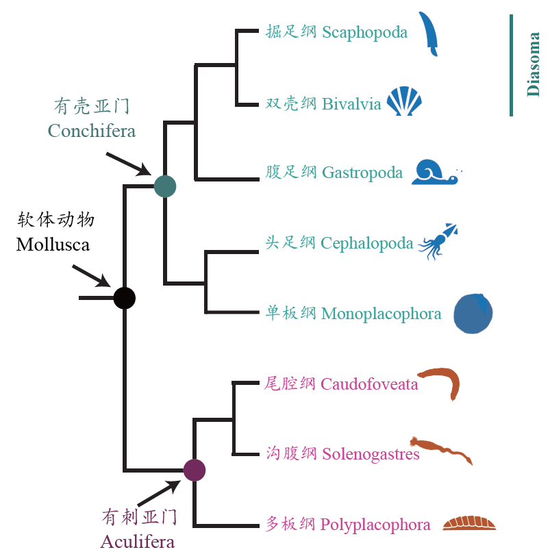 This is particularly true for the second largest phylum, Mollusca, whose major lineages originated in the Cambrian period. The diverse fossil record, extreme morphological disparity among the eight living classes, and dramatic conflict among phylogenetic hypotheses due to diverse paleontological, morphological and molecular evidence hinder the understanding of molluscan phylogeny.