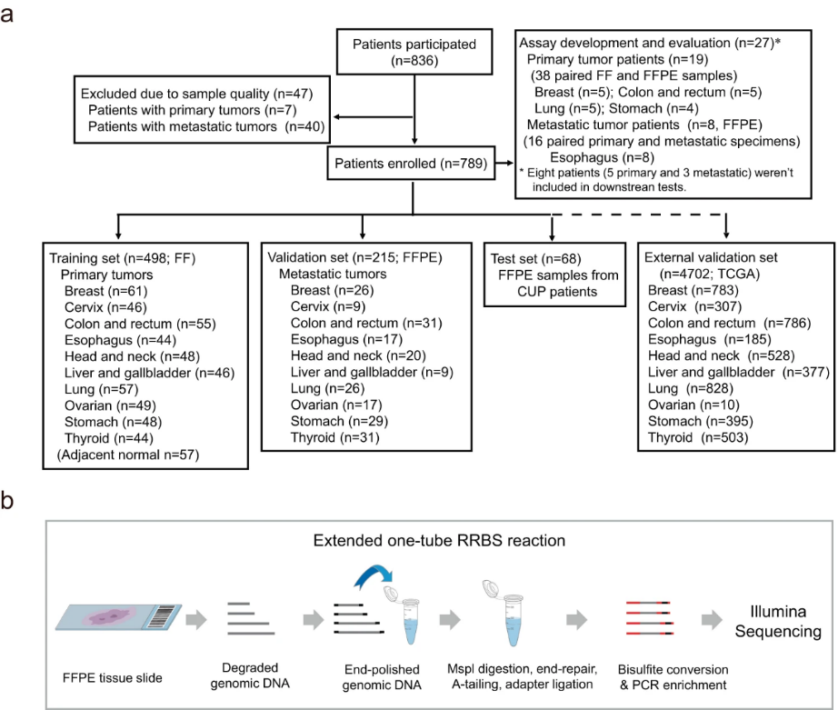 a. Flow chart of participants; b. Schematic diagram of the FFPE-RRBS protocol. (Image by ZHANG Shirong)