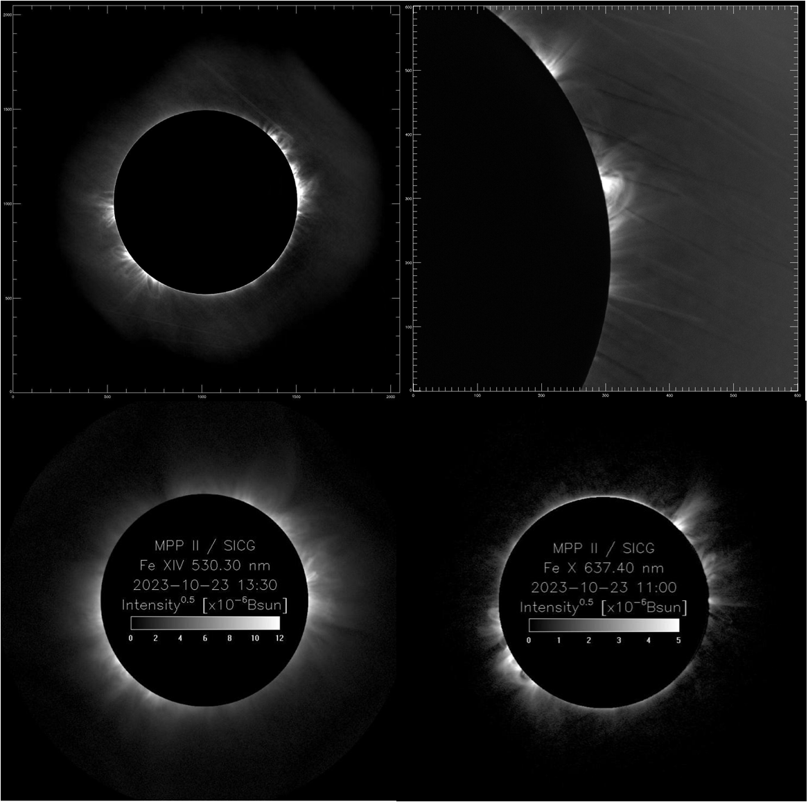SICG adopts an internally occulting refractive optical system with an objective aperture of 220 mm and an observation field of 1.05 Rs to 2.00 Rs (Rs is the solar radius). It can provide observations of the coronal red line and green line.