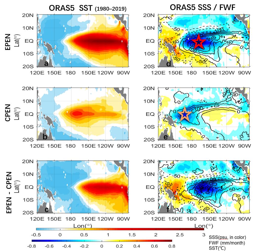 Based on Argo observations and reanalysis products, the researchers found maximum salinity anomalies during the two types of El Niño showed clear different zonal structure, which occurred in the central equatorial Pacific (CEP) during the EPEN and in further western equatorial Pacific (WEP) during CPEN.
