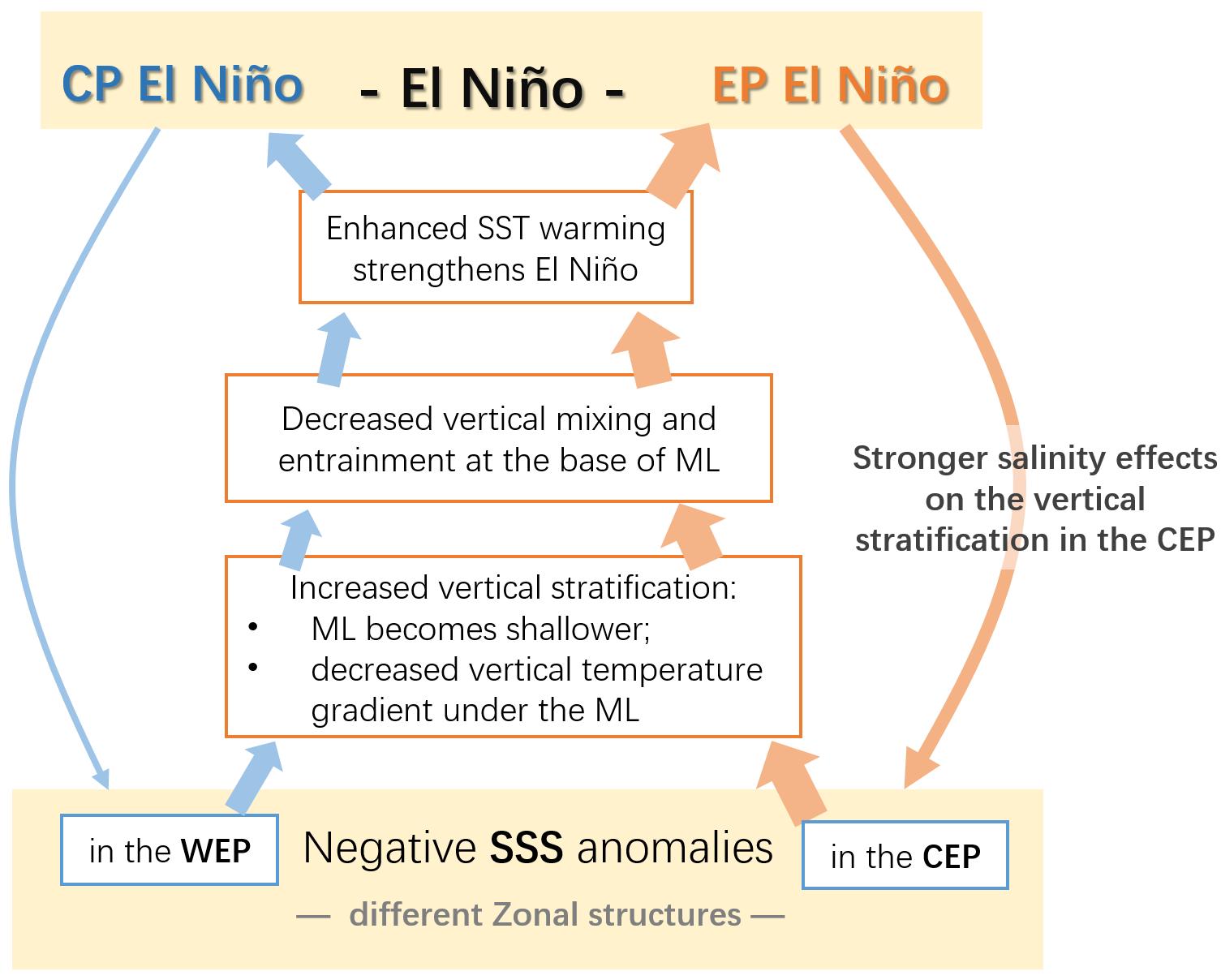 Fig. 2 Schematic diagram illustrating different effects of zonal patterns of SSS anomalies on the CP El Niño and EP El Niño. (Image by IOCAS)