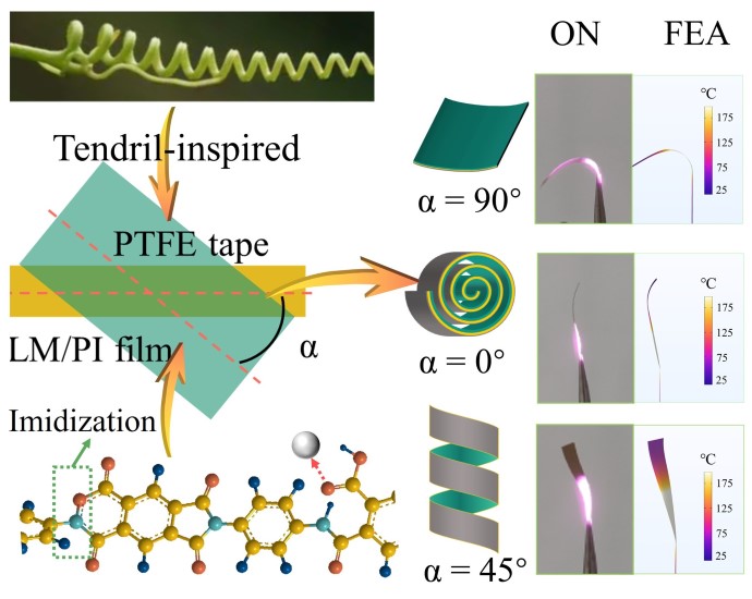 In this research, scientists have built a photothermal actuator using liquid metal/ polyimide (LM/PI) film and PTFE tape that mimics plants' ability to search for sunlight. They used LM/PI film as a support and photothermal layer, while PTFE tape acted as protoplasm that can contract and bend.