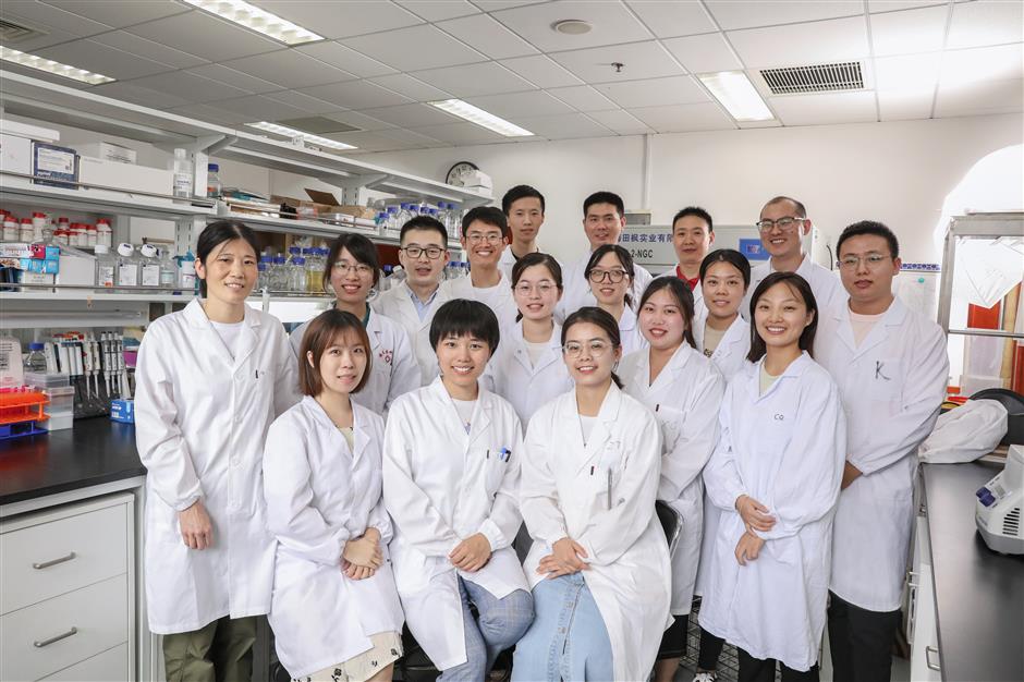 Zhu Shujia (center) poses with her team at the Center for Excellence in Brain Science and Intelligence Technology, Chinese Academy of Sciences.