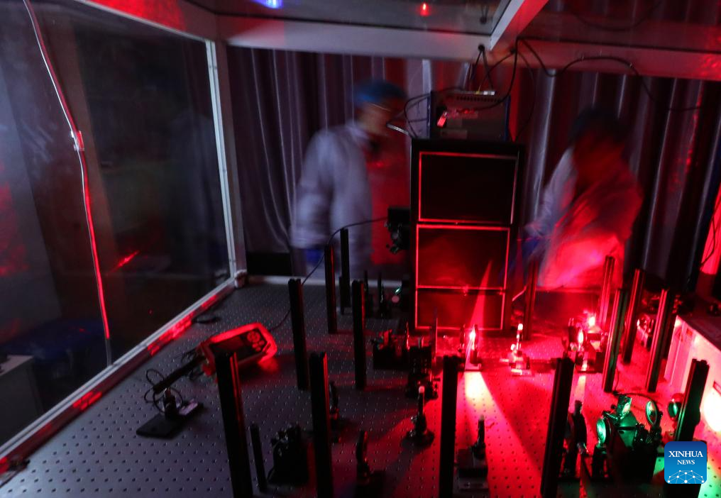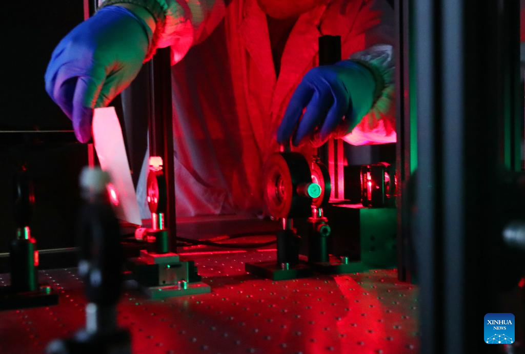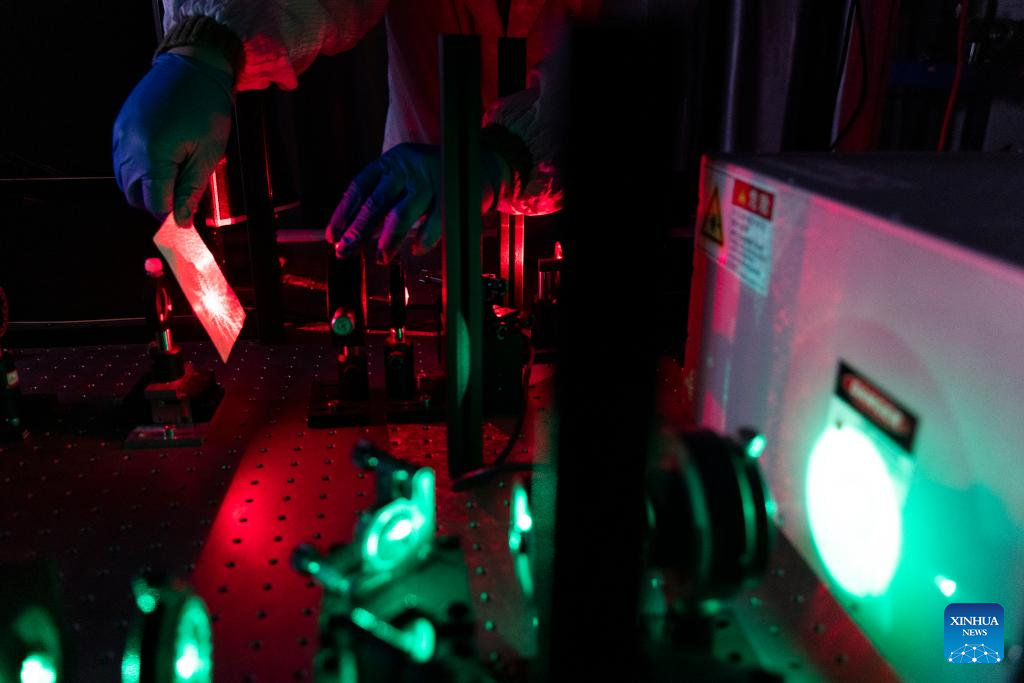 Researchers perform an experiment at a laboratory in the Shanghai Institute of Optics and Fine Mechanics, Chinese Academy of Sciences in east China's Shanghai, Feb. 29, 2024.