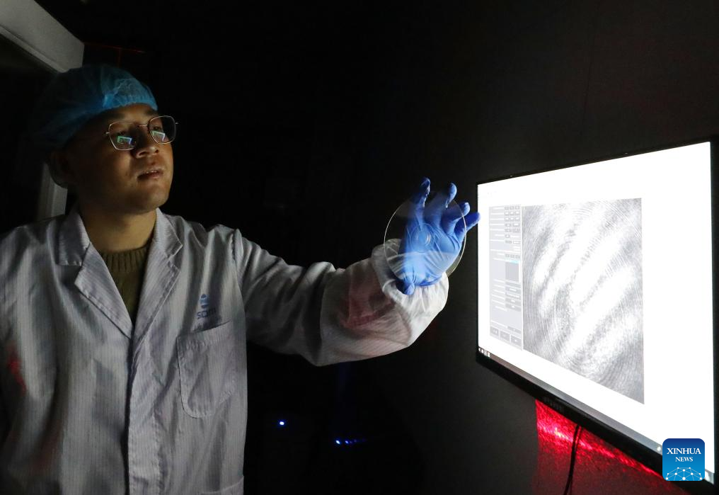 Researcher Zhao Miao shows a three-dimensional nanoscale optical disk memory with petabit capacity in the Shanghai Institute of Optics and Fine Mechanics, Chinese Academy of Sciences in east China's Shanghai, Feb. 29, 2024. (Xinhua/Jin Liwang)