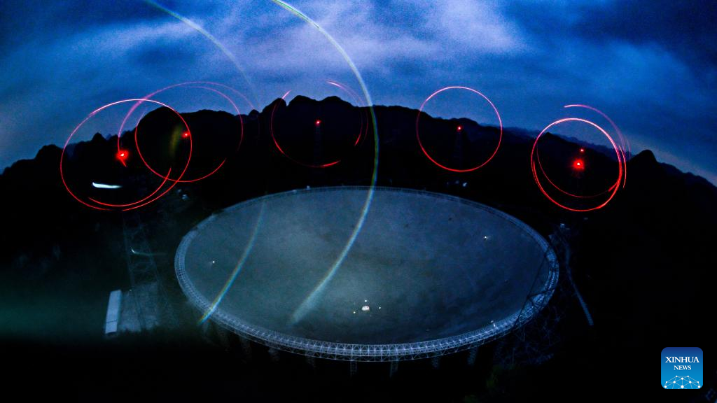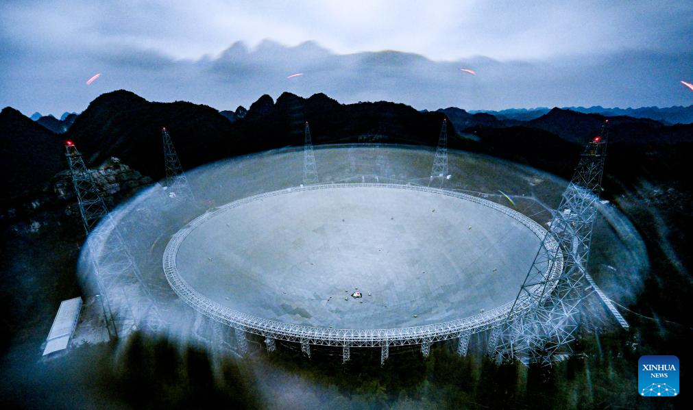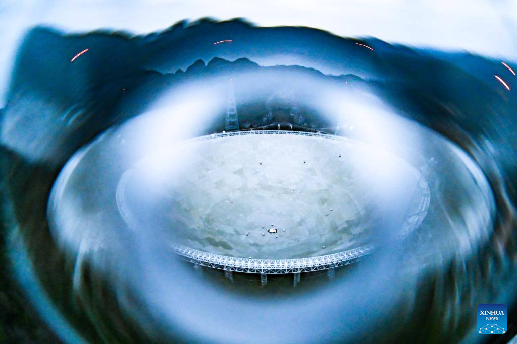 This photo taken on Feb. 26, 2024 with physical filter shows China's Five-hundred-meter Aperture Spherical Radio Telescope (FAST) under maintenance in southwest China's Guizhou Province. China's Five-hundred-meter Aperture Spherical Radio Telescope (FAST), the world's largest single-dish radio telescope, has identified more than 900 new pulsars since its launch in 2016, its operator said Wednesday. (Xinhua/Ou Dongqu)