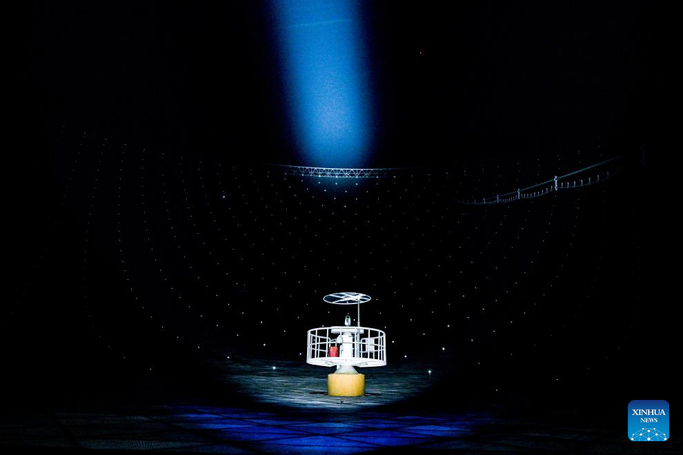 This photo taken on Feb. 27, 2024 shows an interior view of China's Five-hundred-meter Aperture Spherical Radio Telescope (FAST) under maintenance in southwest China's Guizhou Province. China's Five-hundred-meter Aperture Spherical Radio Telescope (FAST), the world's largest single-dish radio telescope, has identified more than 900 new pulsars since its launch in 2016, its operator said Wednesday. (Xinhua/Ou Dongqu)