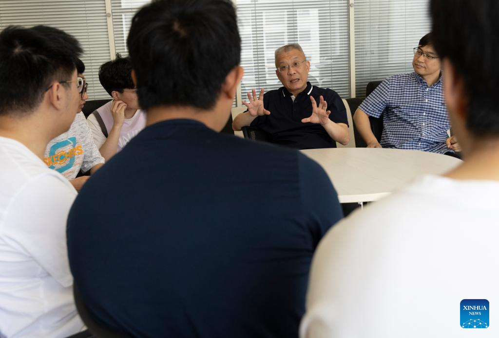 Fang Zhong (2nd R) and his team member Weng Hongming talk with students at the Institute of Physics, Chinese Academy of Sciences in Beijing, capital of China, June 19, 2024. (Xinhua/Jin Liwang)