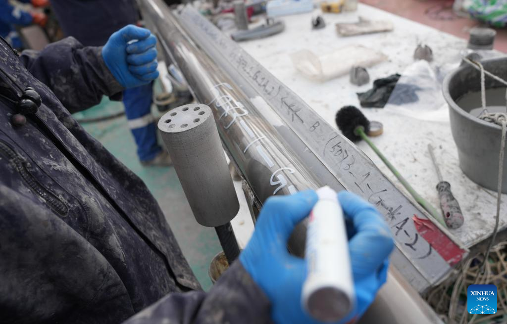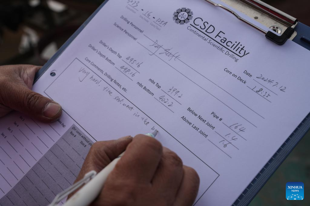 A researcher registers the samples collected from the lake core of 402.2 meters on Nam Co, in southwest China's Xizang Autonomous Region, July 12, 2024. (Xinhua/Jigme Dorje)
