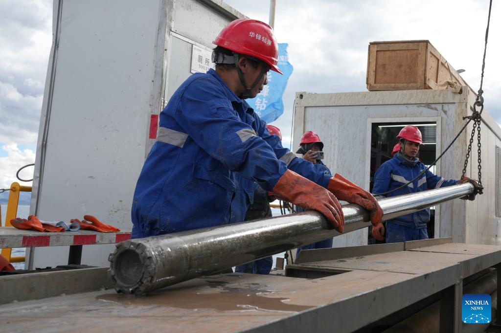 Technicians collect samples from the lake core of 402.2 meters on Nam Co, in southwest China's Xizang Autonomous Region, July 12, 2024. (Xinhua/Jigme Dorje)