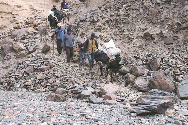 Members of the Chinese-Tajik scientific team climb to the Lake Sarez area in 2021. [Photo provided to China Daily]