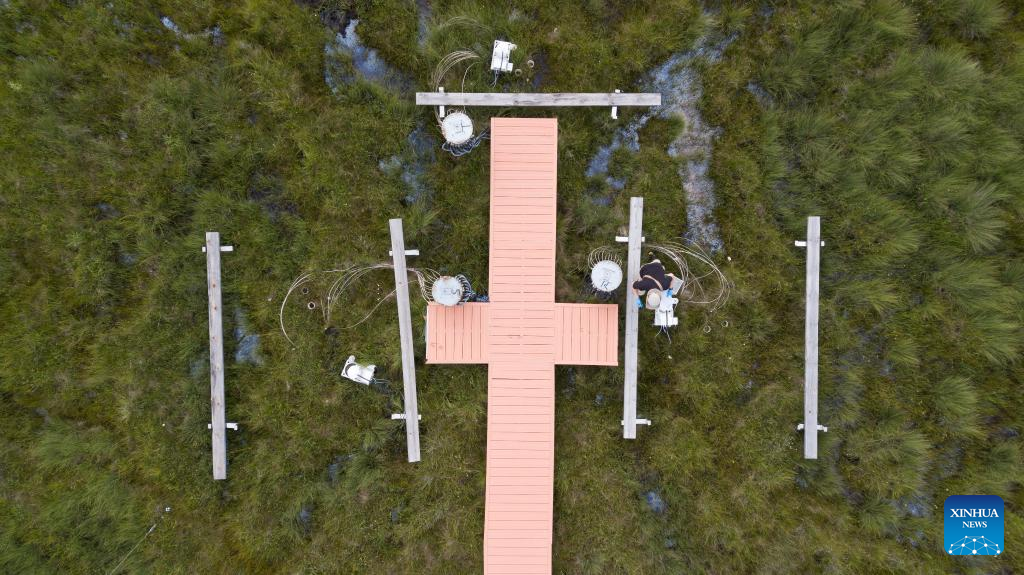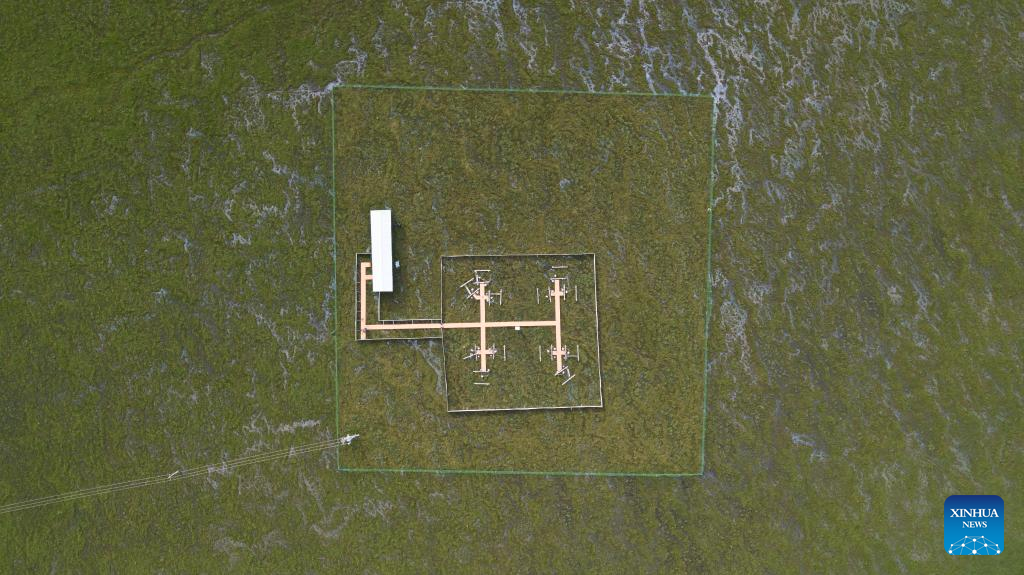 An aerial drone photo taken on July 25, 2024, shows researchers collecting samples at a test platform in Zoige wetland in the Aba Tibetan and Qiang Autonomous Prefecture, southwest China's Sichuan Province. The Zoige Wetland Ecology Research Station, established by the Chengdu Institute of Biology of the Chinese Academy of Sciences in the Aba Tibetan and Qiang Autonomous Prefecture in southwest China's Sichuan Province, went operational on Friday. The station is expected to provide scientific and technical support and policy recommendations for regional ecological protection and sustainable socio-economic development in southwest China, and also make scientific explorations for global wetland protection, according to Gao Yongheng, head of the research station. The Zoige plateau, one of the main distribution areas of high-altitude wetlands in China, serves as an important ecological barrier. With the backdrop of global climate change, the region is facing significant ecological challenges, including biodiversity loss and a weakened wetland ecosystem, scientists say. (Xinhua/Jin Liwang)