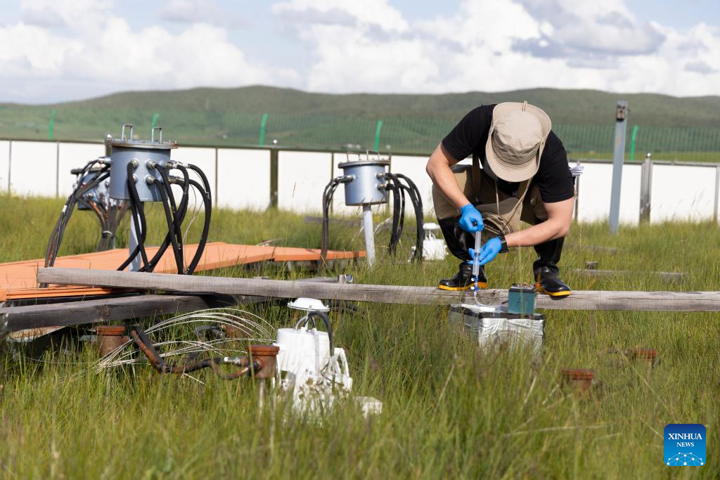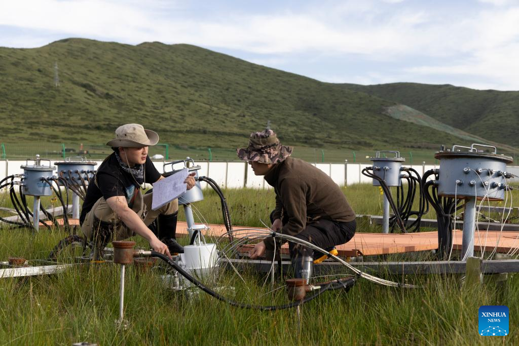 Researchers collect samples at a test platform in Zoige wetland in the Aba Tibetan and Qiang Autonomous Prefecture, southwest China's Sichuan Province, July 25, 2024. (Xinhua/Jin Liwang)