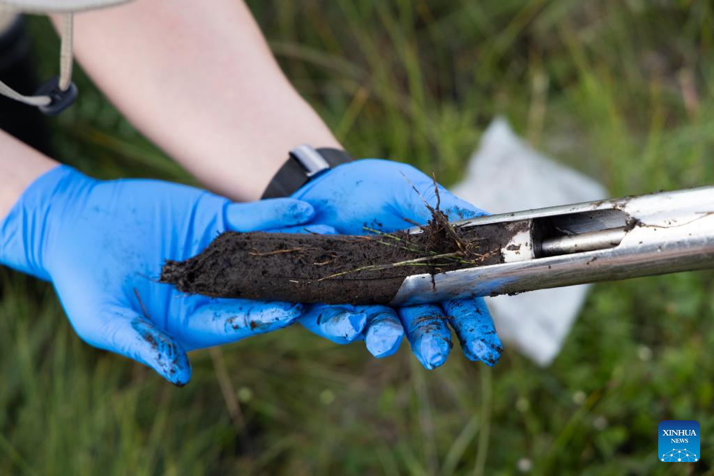 Researchers collect a peatland sample at a test platform in Zoige wetland in the Aba Tibetan and Qiang Autonomous Prefecture, southwest China's Sichuan Province, July 25, 2024. (Xinhua/Jin Liwang)