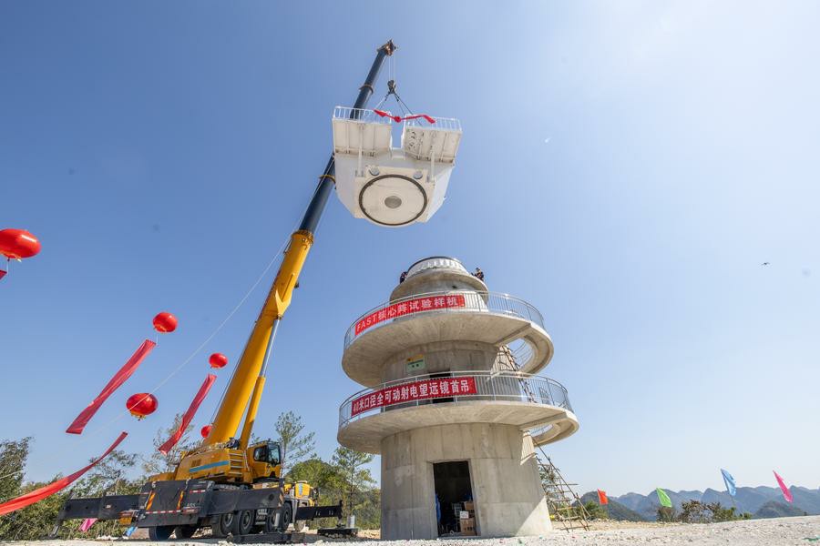 This photo taken on Sept. 25, 2024 shows the first test prototype of the Core Array of China's Five-hundred-meter Aperture Spherical Radio Telescope (FAST) being installed in southwest China's Guizhou Province. (Xinhua/Ou Dongqu)