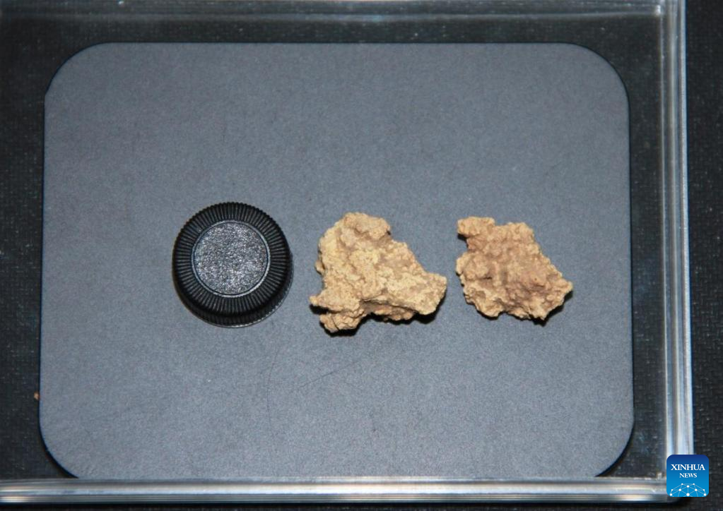 This undated file photo shows the comparison of a tube cap (L) and two Bronze Age cheese samples unearthed from a tomb site in northwest China's Xinjiang Uygur Autonomous Region. The 3,500-year-old mummies unearthed two decades ago in Xinjiang region captured global attention this week after scientists sequenced DNA from three cheese samples found at their burial site, revealing the secrets of the world's oldest known fermented dairy products. (Photo by Yang Yimin/Xinhua)