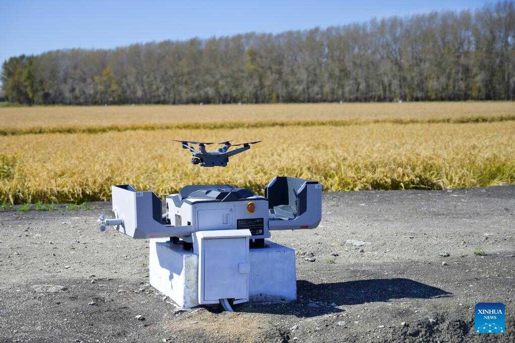 A drone returns automatically after an intelligent field patrol mission at an agricultural experiment station in Shuangyashan City, northeast China's Heilongjiang Province, Sept. 28. 2024. (Xinhua/Shi Feng)