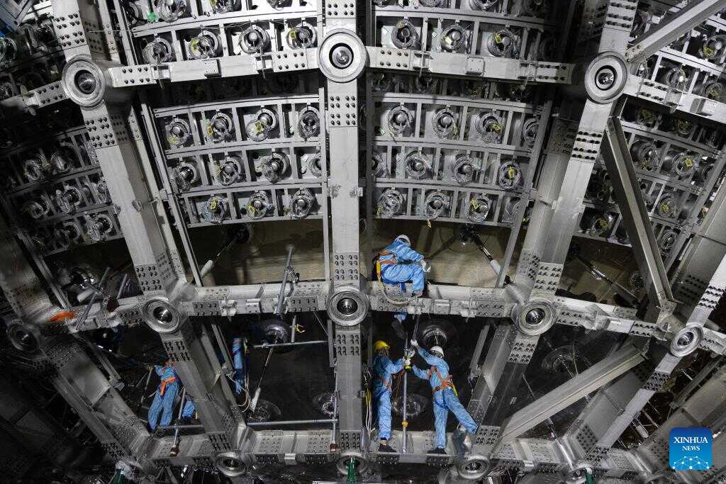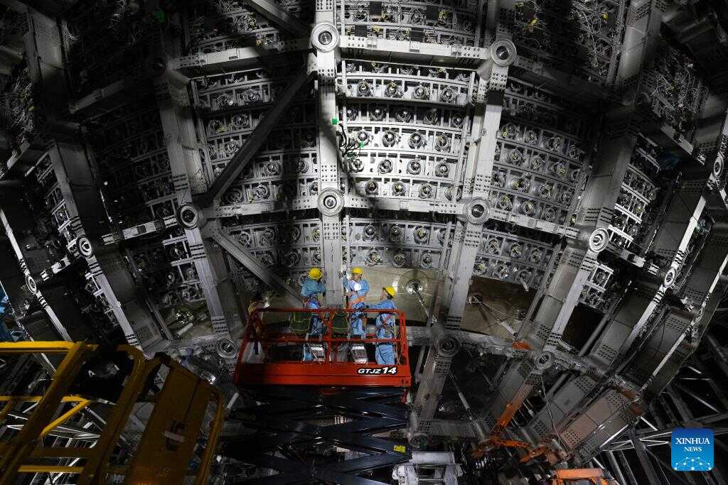Staff members work on a stainless steel frame of the central detector of the Jiangmen Underground Neutrino Observatory (JUNO) in Jiangmen, south China's Guangdong Province, Oct. 10, 2024. China has constructed the world's largest transparent spherical detector 700 meters underground to capture elusive neutrinos, often dubbed "ghost particles," to unravel the secrets of the infinitesimally small and the infinitely vast in the universe. (Xinhua/Jin Liwang)