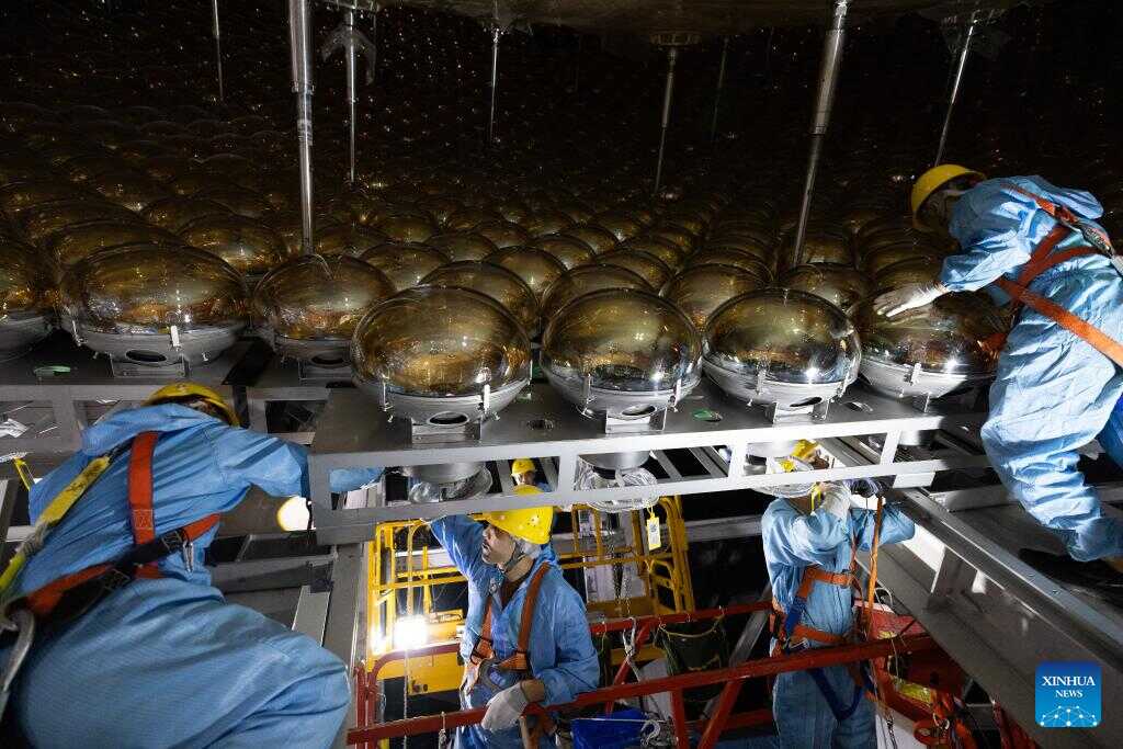 Staff members install photo-multiplier tubes of the central detector of the Jiangmen Underground Neutrino Observatory (JUNO) in Jiangmen, south China's Guangdong Province, Oct. 10, 2024. China has constructed the world's largest transparent spherical detector 700 meters underground to capture elusive neutrinos, often dubbed "ghost particles," to unravel the secrets of the infinitesimally small and the infinitely vast in the universe. (Xinhua/Jin Liwang)