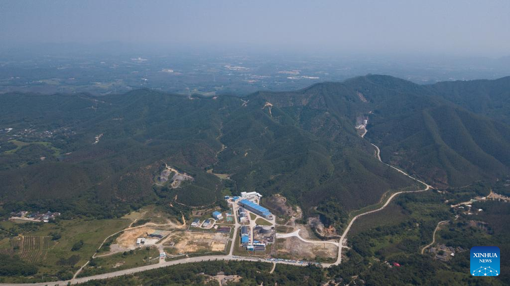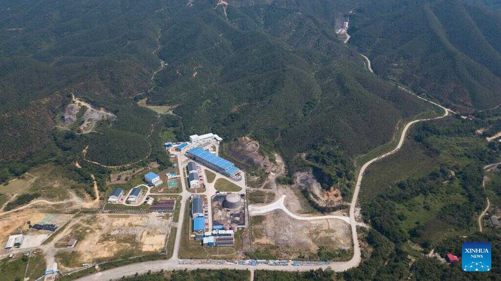 An aerial drone photo shows ground facilities of the Jiangmen Underground Neutrino Observatory (JUNO) in Jiangmen, south China's Guangdong Province, Oct. 10, 2024. China has constructed the world's largest transparent spherical detector 700 meters underground to capture elusive neutrinos, often dubbed "ghost particles," to unravel the secrets of the infinitesimally small and the infinitely vast in the universe. (Xinhua/Jin Liwang)