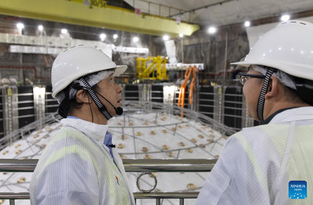 Ma Xiaoyan (L) talks with a staff member at the bottom of the water tank of the central detector of the Jiangmen Underground Neutrino Observatory (JUNO) in Jiangmen, south China's Guangdong Province, Oct. 10, 2024. China has constructed the world's largest transparent spherical detector 700 meters underground to capture elusive neutrinos, often dubbed "ghost particles," to unravel the secrets of the infinitesimally small and the infinitely vast in the universe. (Xinhua/Jin Liwang)