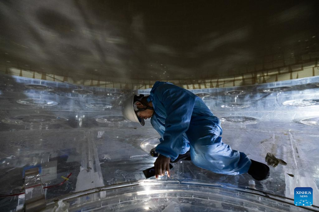 A staff member works beside the water tank of the central detector of the Jiangmen Underground Neutrino Observatory (JUNO) in Jiangmen, south China's Guangdong Province, Oct. 9, 2024. China has constructed the world's largest transparent spherical detector 700 meters underground to capture elusive neutrinos, often dubbed "ghost particles," to unravel the secrets of the infinitesimally small and the infinitely vast in the universe. (Xinhua/Jin Liwang)