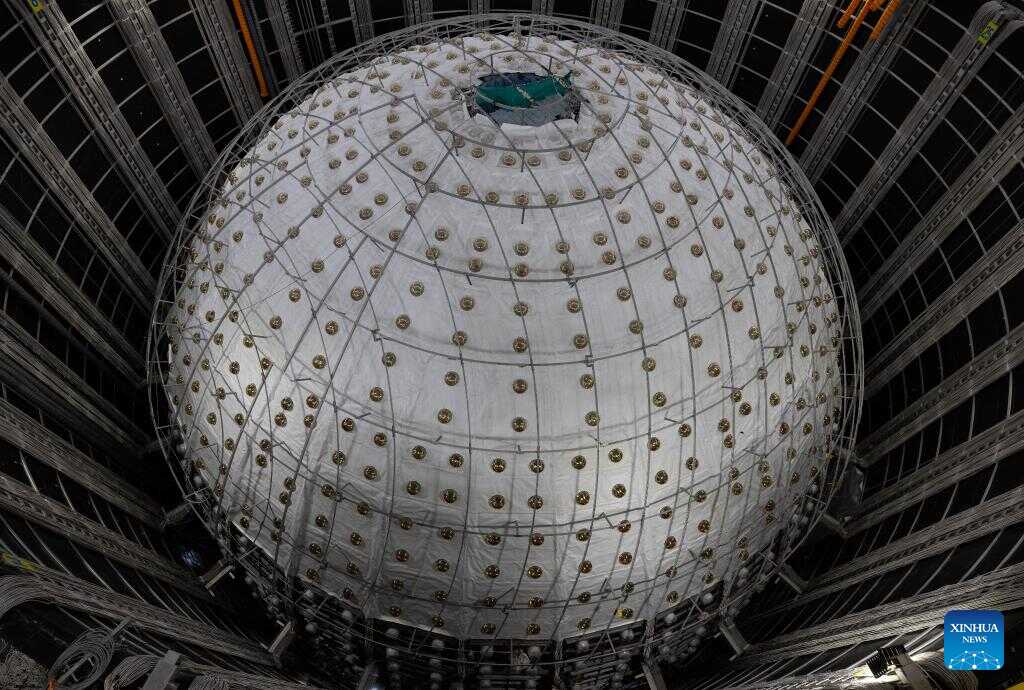 This photo shows the central detector of the Jiangmen Underground Neutrino Observatory (JUNO) under construction in Jiangmen, south China's Guangdong Province, Oct. 9, 2024. China has constructed the world's largest transparent spherical detector 700 meters underground to capture elusive neutrinos, often dubbed "ghost particles," to unravel the secrets of the infinitesimally small and the infinitely vast in the universe. (Xinhua/Jin Liwang)