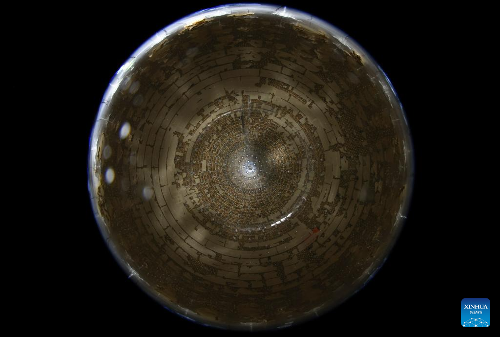 This photo taken on Nov. 23, 2024 shows the acrylic sphere of the central detector of the Jiangmen Underground Neutrino Observatory (JUNO) being cleaned in Jiangmen, south China's Guangdong Province. The main part of the central detector has been constructed recently. As one of the world's most powerful experiments to uncover neutrino mystery, JUNO is expected to operate for at least 30 years. (Xinhua/Jin Liwang)