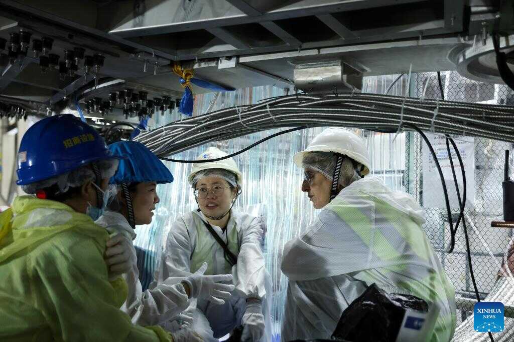 Researcher Zhao Jie (2nd L) and Italian expert Monica Sisti (1st R) discuss the cleaning of the acrylic sphere of the central detector of the Jiangmen Underground Neutrino Observatory (JUNO) in Jiangmen, south China's Guangdong Province, Nov. 22, 2024. The main part of the central detector has been constructed recently. As one of the world's most powerful experiments to uncover neutrino mystery, JUNO is expected to operate for at least 30 years. (Xinhua/Jin Liwang)