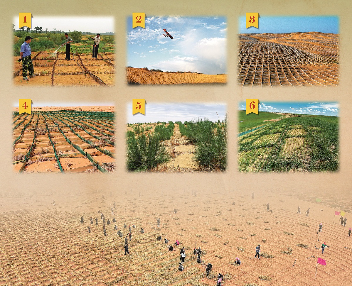From 1 to 6: Farmers spray a crust-forming solution to prevent soil erosion. Airplanes are used to sow tree seeds to combat desertification. Biodegradable sandbags and sand barriers made from polylactic acid fiber materials. Nylon mesh sand barriers. Grass pavers made with salt-tolerant shrubs grow in the Kumtag Desert in a grid pattern as sand barriers. Manure sandbags fully covered with grass. Below: Local farmers use planting techniques to cover the grid-patterned sand barrier in Zhongwei, Ningxia Hui autonomous region, with vegetation. CHINA DAILY