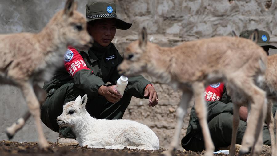 A ranger feeds a Tibetan antelope cub in Nyima County of Nagqu City, southwest China's Xizang Autonomous Region, July 13, 2024. A white Tibetan antelope cub is recently rescued by a ranger on patrol in Nyima County, which is the first white Tibetan antelope ever found by rangers in the wild of the area. (Photo by Tenzing/Xinhua)