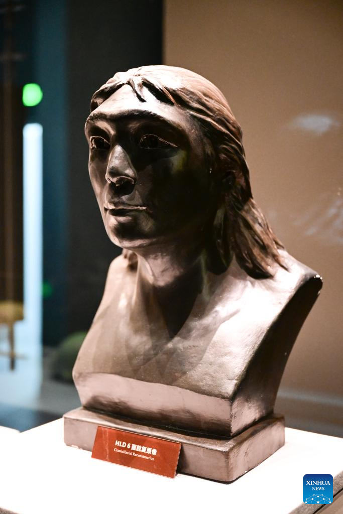 This picture taken on Dec. 6, 2024 shows a craniofacial reconstruction on display at the exhibition hall of Hualongdong site in Dongzhi County of Chizhou City, east China's Anhui Province. (Xinhua/Zhou Mu)