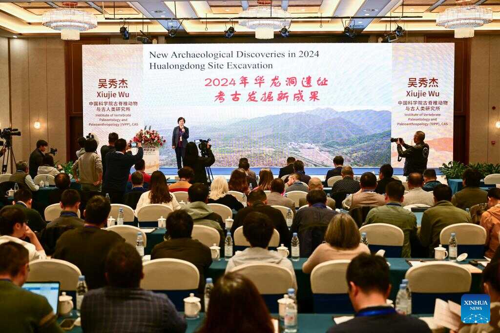 Wu Xiujie, a researcher at the Institute of Vertebrate Paleontology and Paleoanthropology of the Chinese Academy of Sciences, introduces the latest discoveries and studies concerning the Hualongdong ancient human site during the Hualongdong site academic conference in Dongzhi County of Chizhou City, east China's Anhui Province, Dec. 6, 2024. (Xinhua/Zhou Mu)