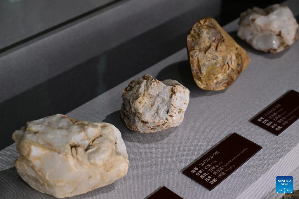 This photo taken on Dec. 6, 2024 shows stone artifacts displayed at the exhibition hall of Hualongdong site in Dongzhi County of Chizhou City, east China's Anhui Province. (Xinhua/Zhou Mu)