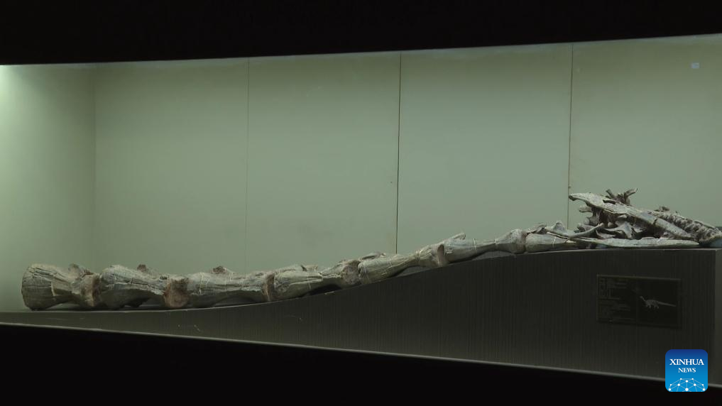 This photo taken on Dec. 14, 2024 shows the fossils of Lishulong wangi displayed in Lufeng City, southwest China's Yunnan Province. (Photo by Liu Zenghui/Xinhua)