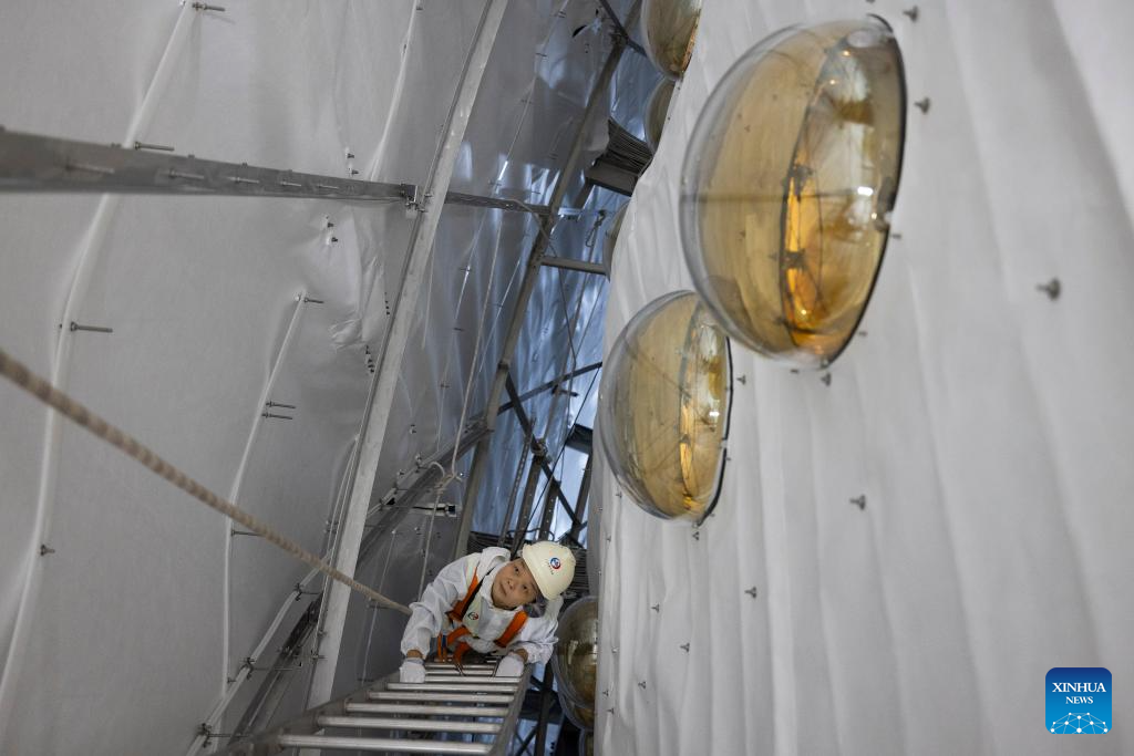 A researcher adjusts displacement sensors at the top of the central detector of the Jiangmen Underground Neutrino Observatory (JUNO) in Jiangmen, south China's Guangdong Province, Dec. 17, 2024. (Xinhua/Jin Liwang)