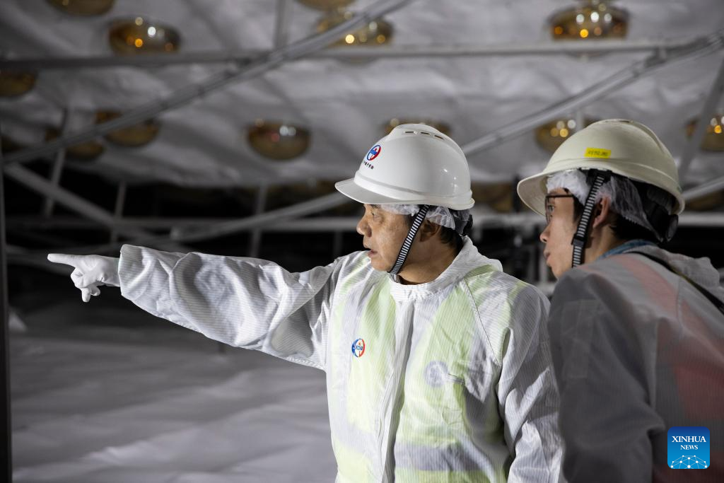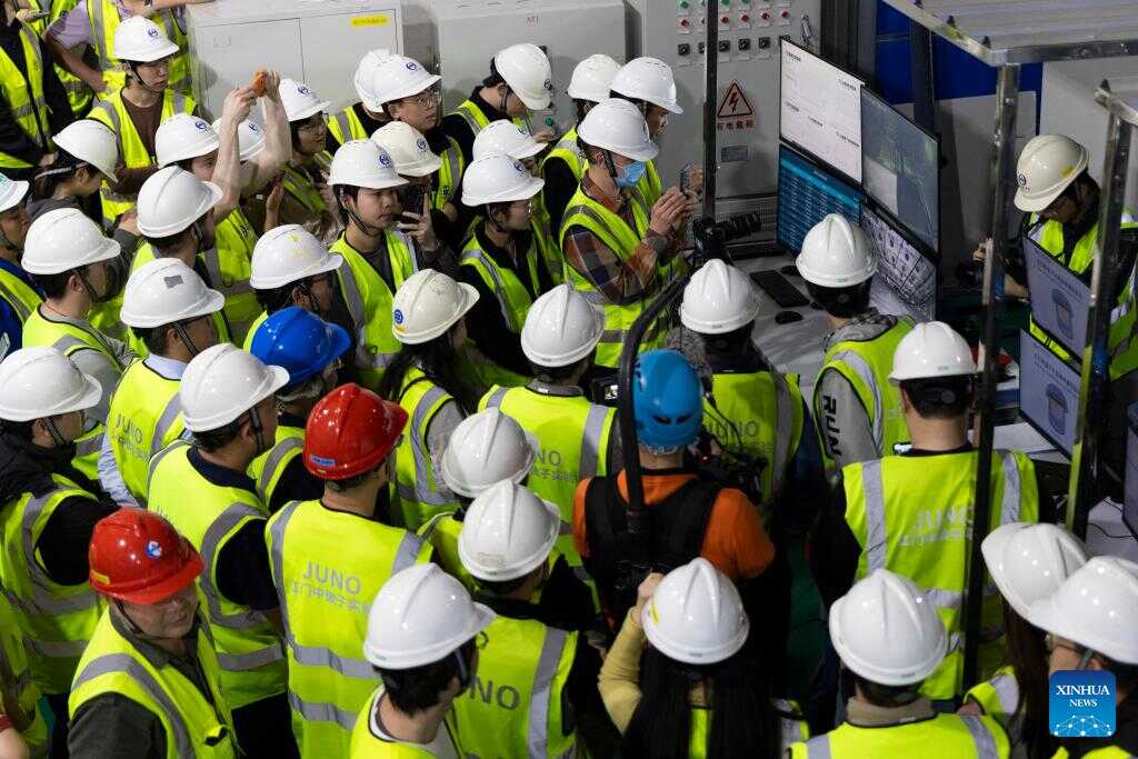 Researchers observe the status of the water tank after the liquid filling process started at the Jiangmen Underground Neutrino Observatory (JUNO) in Jiangmen, south China's Guangdong Province, Dec. 18, 2024. (Xinhua/Jin Liwang)