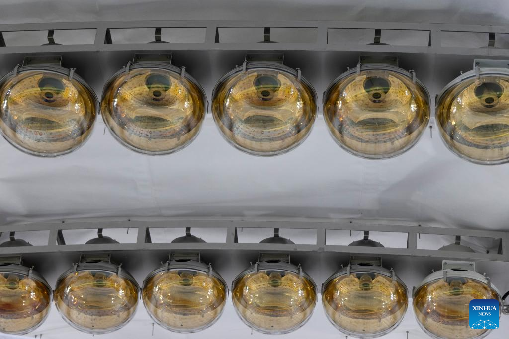 This photo taken on Dec. 17, 2024 shows photo-multiplier tubes seen from the top of the acrylic sphere of the Jiangmen Underground Neutrino Observatory (JUNO) in Jiangmen, south China's Guangdong Province. (Xinhua/Jin Liwang)
