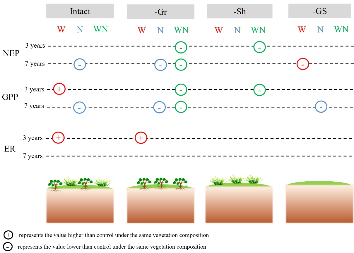 The impacts of climate warming and N addition on net ecosystem production (NEP), ecosystem respiration (ER), and gross primary production (GPP) in the bog under different vegetation compositions (Image by GONG Yu)