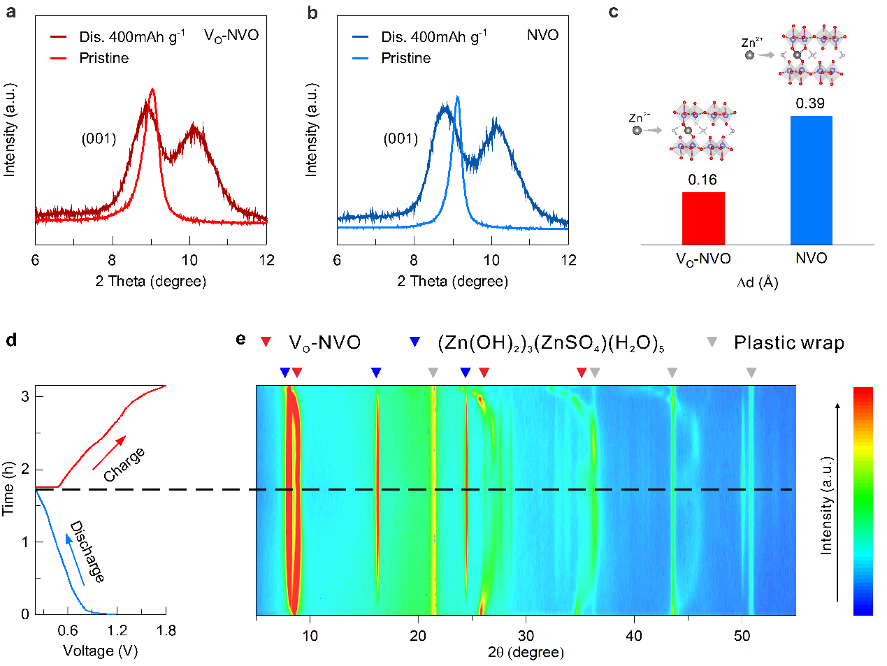 The generation of oxygen vacancies in the NVO lattice can accelerate the ion and charge transfer kinetics, reduce the diffusion barrier of zinc ions, and establish a stable crystal structure during zinc ion (de-intercalation). This defect engineering also facilitates the enhancement of the surface capacitive contribution of NVO due to the higher electrochemical surface reactivity and lower number of formation electrons required.