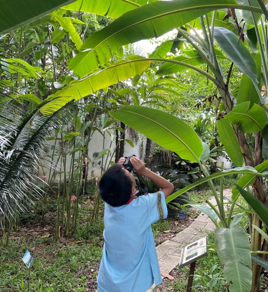A child observing the flowers on the tree with binoculars in the school garden. (Image by KONG Chuwei)