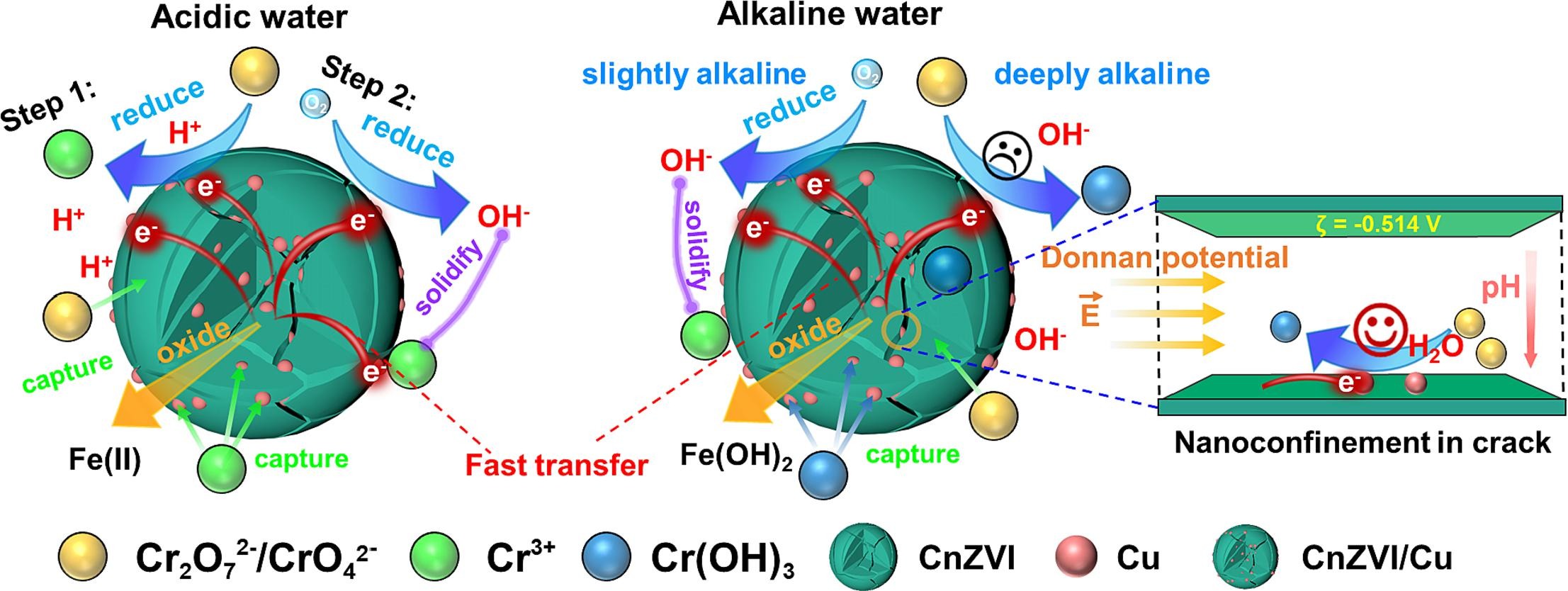 Schematic illustration of Cr(VI) removal mechanism by CnZVI/Cu at acidic/alkaline conditions. (Image by LI Sijia)