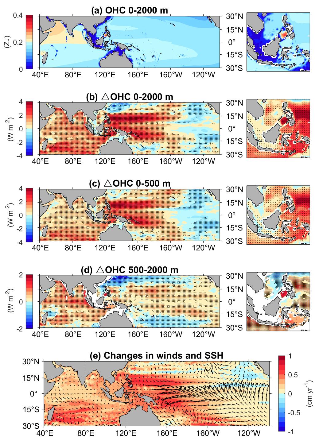 (a) Climatology of the 0-2000 m OHC. (b-d) △OHC between 1990-2000 and 2005-2015 periods for 0-2000 (b), 0-500 (c), and 500-2000 m (d). (e) Changes in winds (vectors; m s-1 yr-1) and SSH (color; in cm yr-1). (Image by IOCAS)